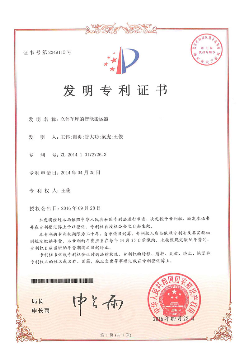 • 立體車庫(kù)智能搬運(yùn)-專利證書(shū)