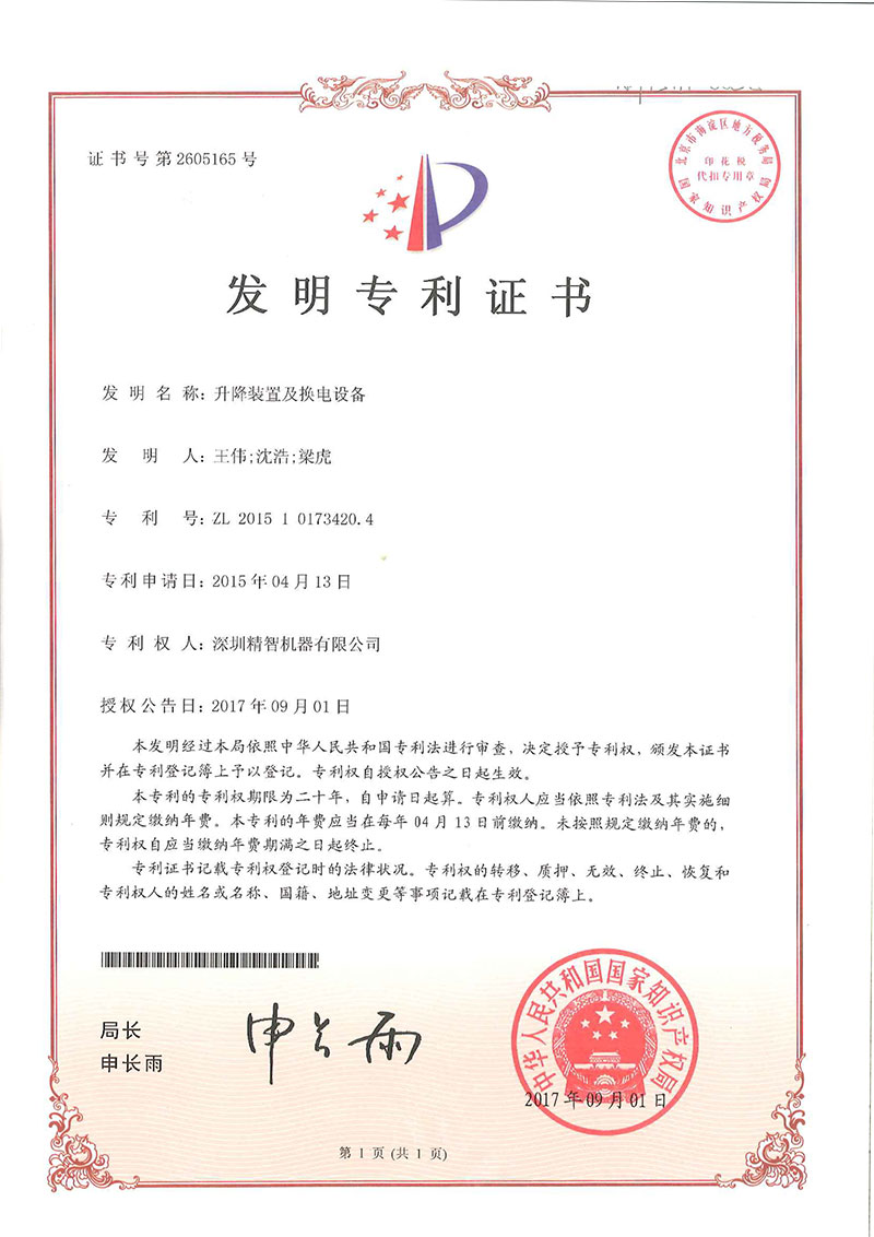 • 升降裝置及換電設(shè)備-專利證書(shū)