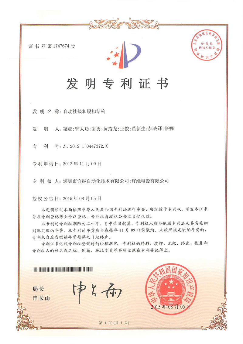 • 自動(dòng)掛接和脫扣結(jié)構(gòu)-專利證書(shū)