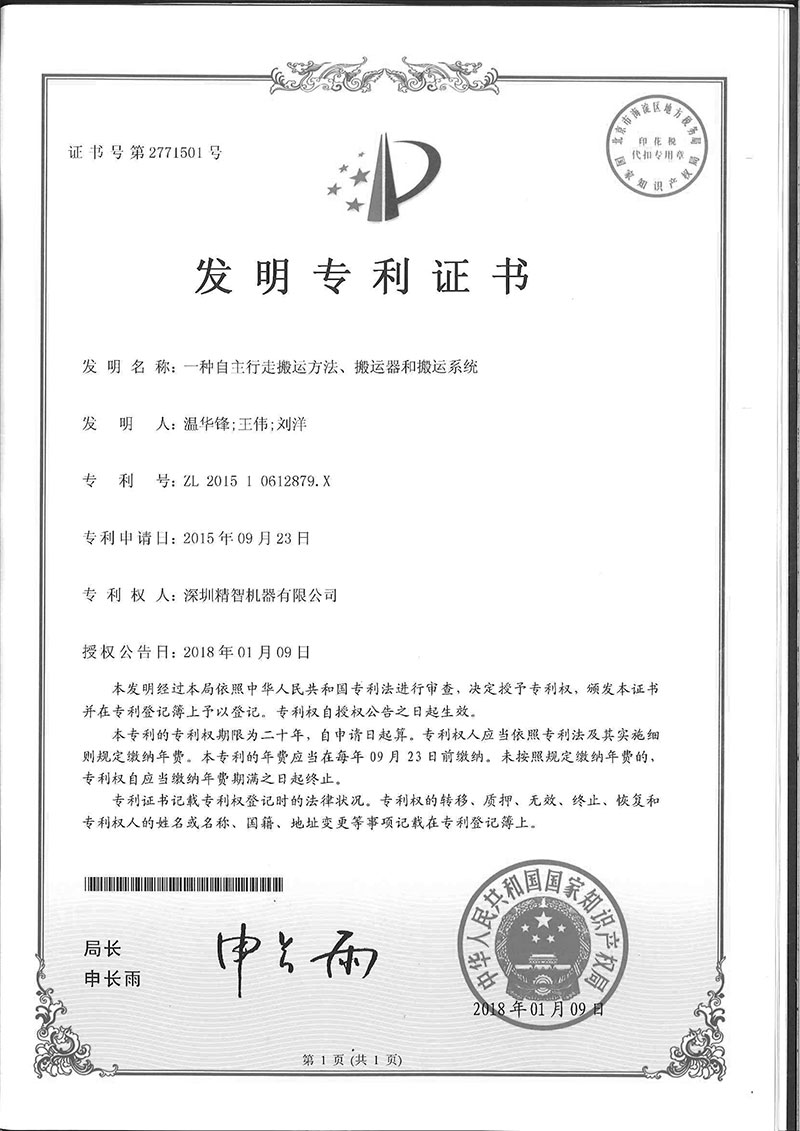 • 自主行走搬運(yùn)方案專利證書(shū)
